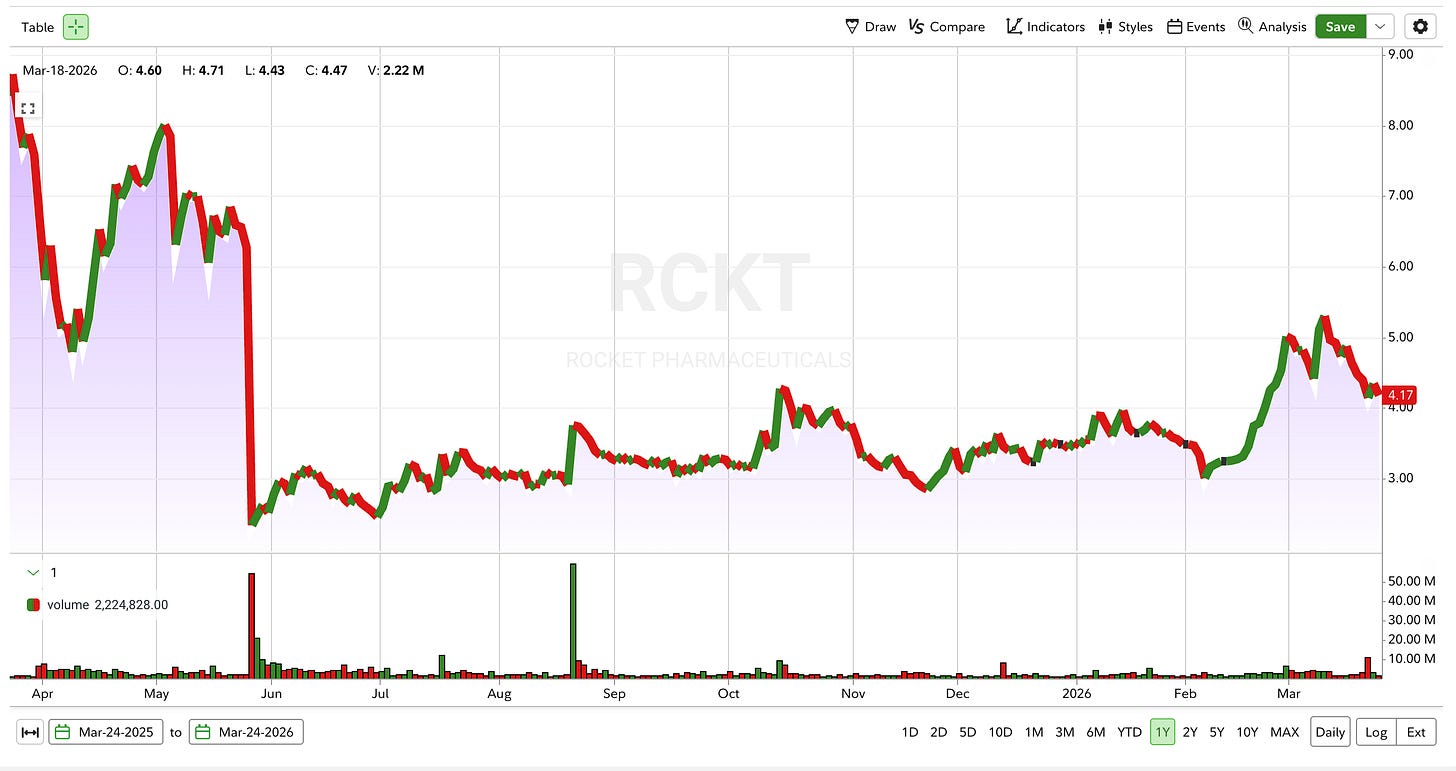 Rocket Pharmaceuticals RCKT 0.00%↑ has its PDUFA date on March 28 for KRESLADI, a one-time gene therapy for severe leukocyte adhesion deficiency type 1. LAD-1, for short, is an ultra-rare pediatric immune disorder that’s basically a death sentence without a bone marrow transplant.